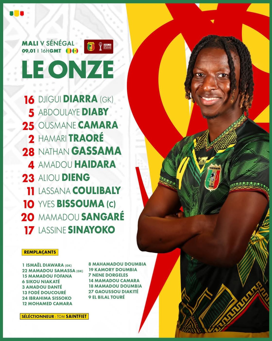 إستقر الجهاز الفني لمنتخب مالي على التشكيل الذي سيخوض به الفريق مباراة اليوم أمام نظيره منتخب السنغال، ضمن مواجهات الدور ربع النهائي من بطولة كأس الأمم الإفريقية المقامة بالمغرب.