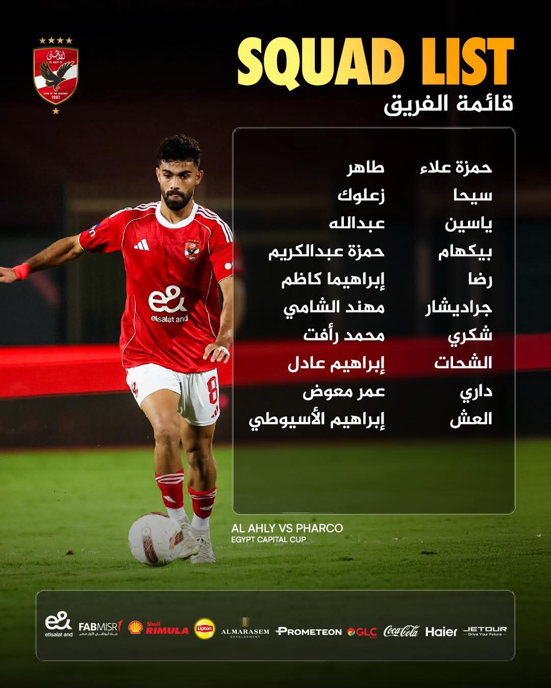 وشهدت قائمة الأهلي ظهور حارس مرمى الفريق حمزة علاء.