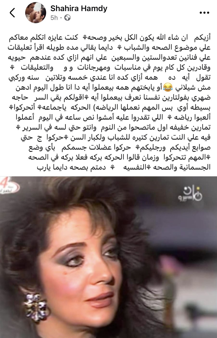 ونشرت شهيرة عبر حسابها الشخصي على موقع “فيسبوك” منشور تحدثت فيه عن ملاحظاتها لتعليقات الجمهور على الفنانين الذين تجاوزوا الستين والسبعين من العمر، والذين ما زالوا يتمتعون بالنشاط والحيوية، حيث كتبت: “كنت عايزه أتكلم معاكم على موضوع الصحة والشباب”.