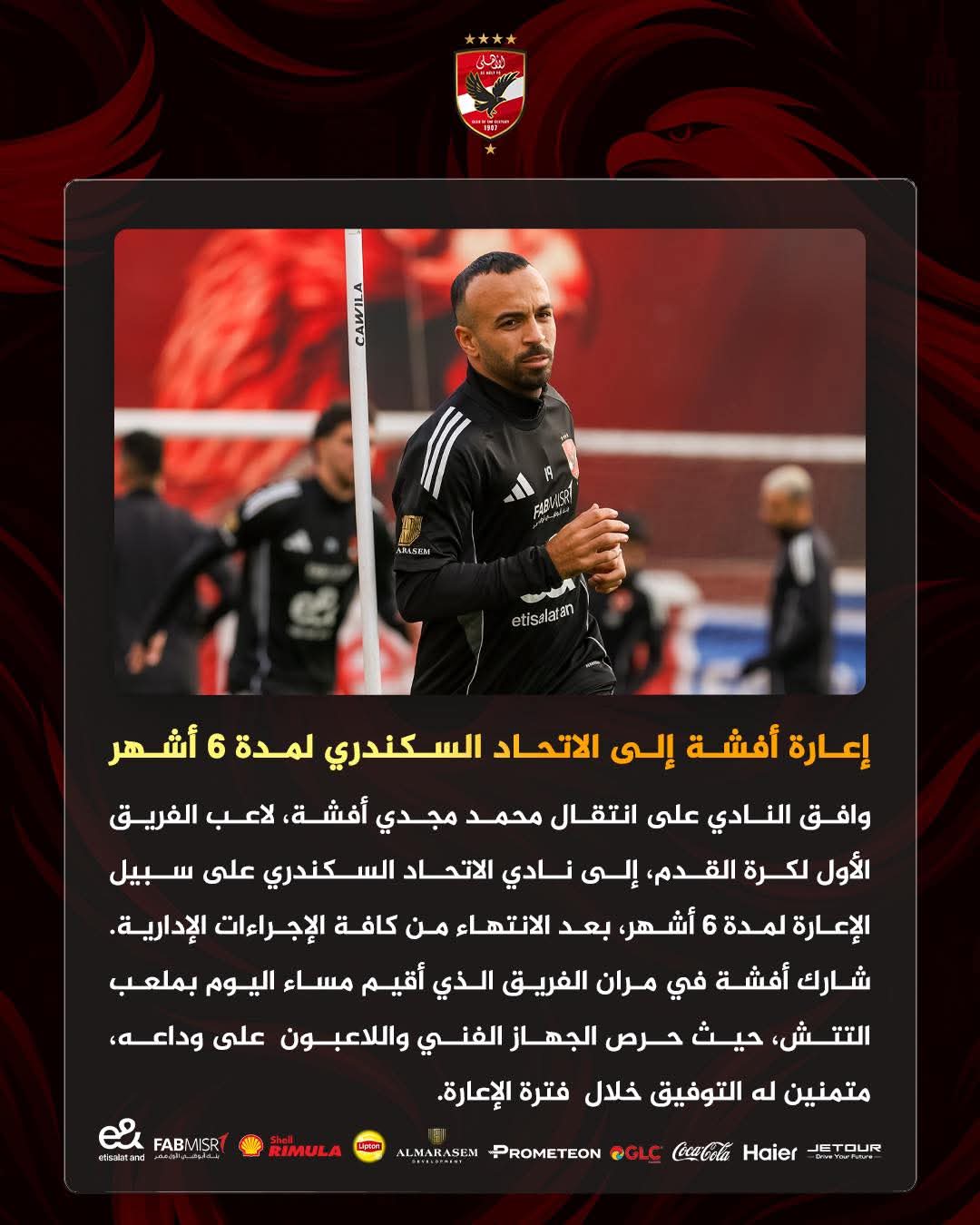 أعلن النادي الأهلي عبر حسابة الرسمي فيس بوك، انتقال نجم خط وسط الفريق محمد مجدي أفشة إلى صفوف نادي الاتحاد السكندري، على سبيل الإعارة لمدة ستة أشهر.