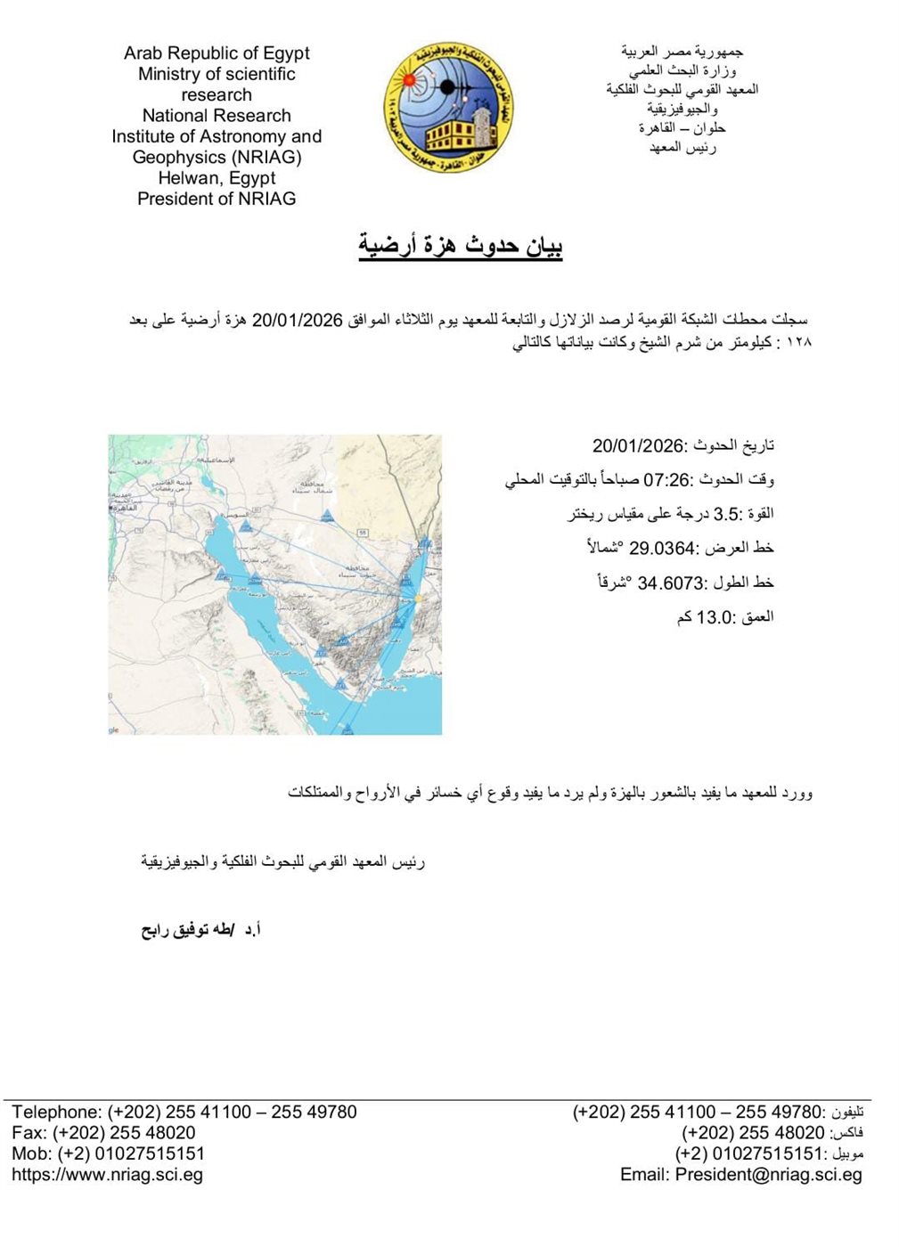 وأكد المعهد القومي للبحوث الفلكية في بيان، أنه لا يوجد أي خسائر في الأرواح والممتلكات.