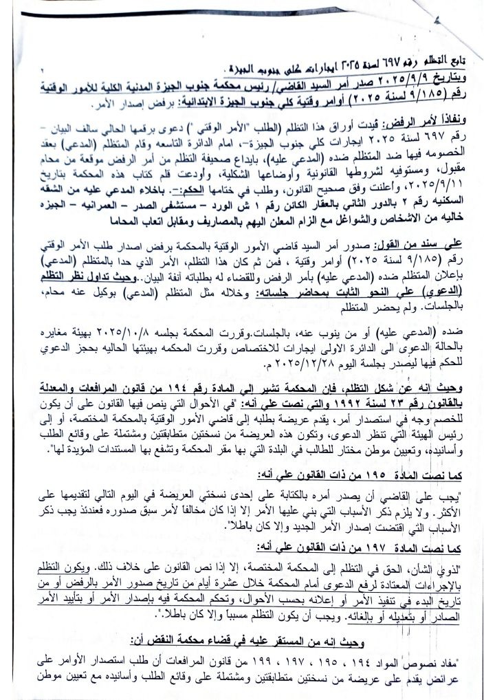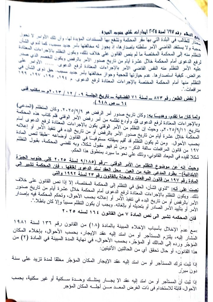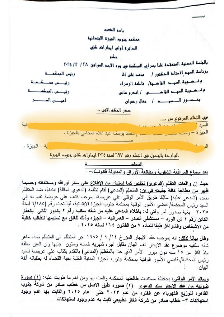 وجاء القرار في التظلم رقم 697 لسنة 2025 إيجارات كلي جنوب الجيزة، برئاسة المستشار الدكتور محمد علي الله رئيس المحكمة، قاضي الأمور الوقتية، حيث ألغت المحكمة أمرًا وقتيًا سابقًا كان قد صدر برفض طلب الإخلاء.
