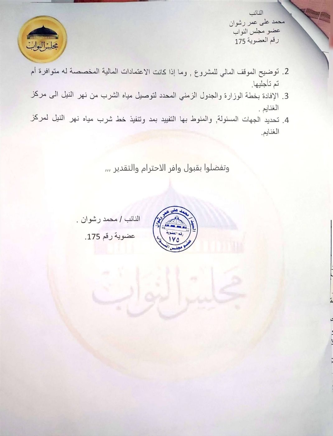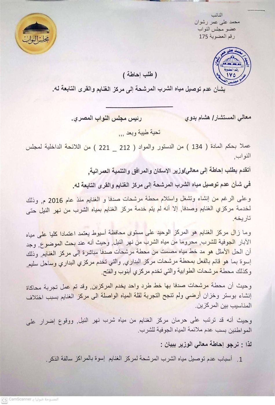 لذا نرجو إحاطة معالي الوزير ببيان : أسباب عدم توصيل مياه الشرب المرشحة لمركز الغنايم إسوة بالمراكز سالفة الذكر وتوضيح الموقف المالي للمشروع , وما إذا كانت الاعتمادات المالية المخصصة له متوافرة أم تم تأجليها والإفادة بخطة الوزارة والجدول الزمني المحدد لتوصيل مياه الشرب من نهر النيل الى مركز الغنايم وتحديد الجهات المسئولة, والمنوط بها التفييد بمد وتنفيذ خط شرب مياه نهر النيل لمركز الغنايم.