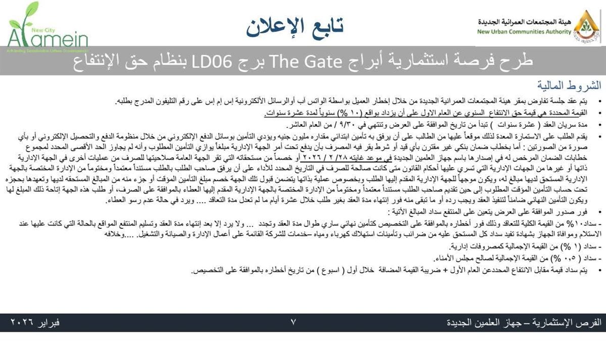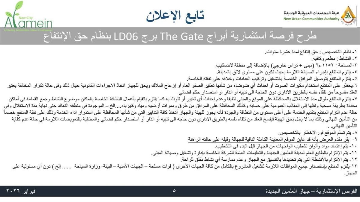 وأكد رئيس الجهاز أن الطرح يتم بنظام حق الانتفاع لمدة 10 سنوات، بما يوفر نموذجًا استثماريًا جاذبًا يحقق التوازن بين تعظيم العائد للمستثمرين وتحقيق قيمة مضافة حقيقية للمدينة، لافتًا إلى أن المشروع يستهدف تقديم تجربة ضيافة راقية تتماشى مع الطابع العالمي لمدينة العلمين الجديدة.