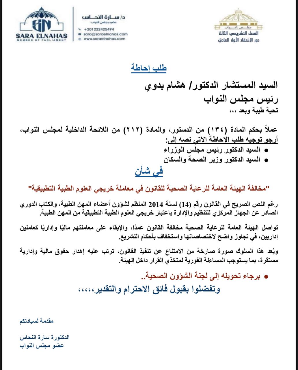 قدمت دكتورة سارة النحاس، عضو لجنة الشئون الصحية مجلس النواب عن حزب مستقبل وطن ، طلب إحاطة إلى الدكتور رئيس مجلس الوزراء والدكتور وزير الصحة والسكان، بشأن استمرار الهيئة العامة للرعاية الصحية في مخالفة القانون والتعنت في معاملة خريجي العلوم الطبية التطبيقية.