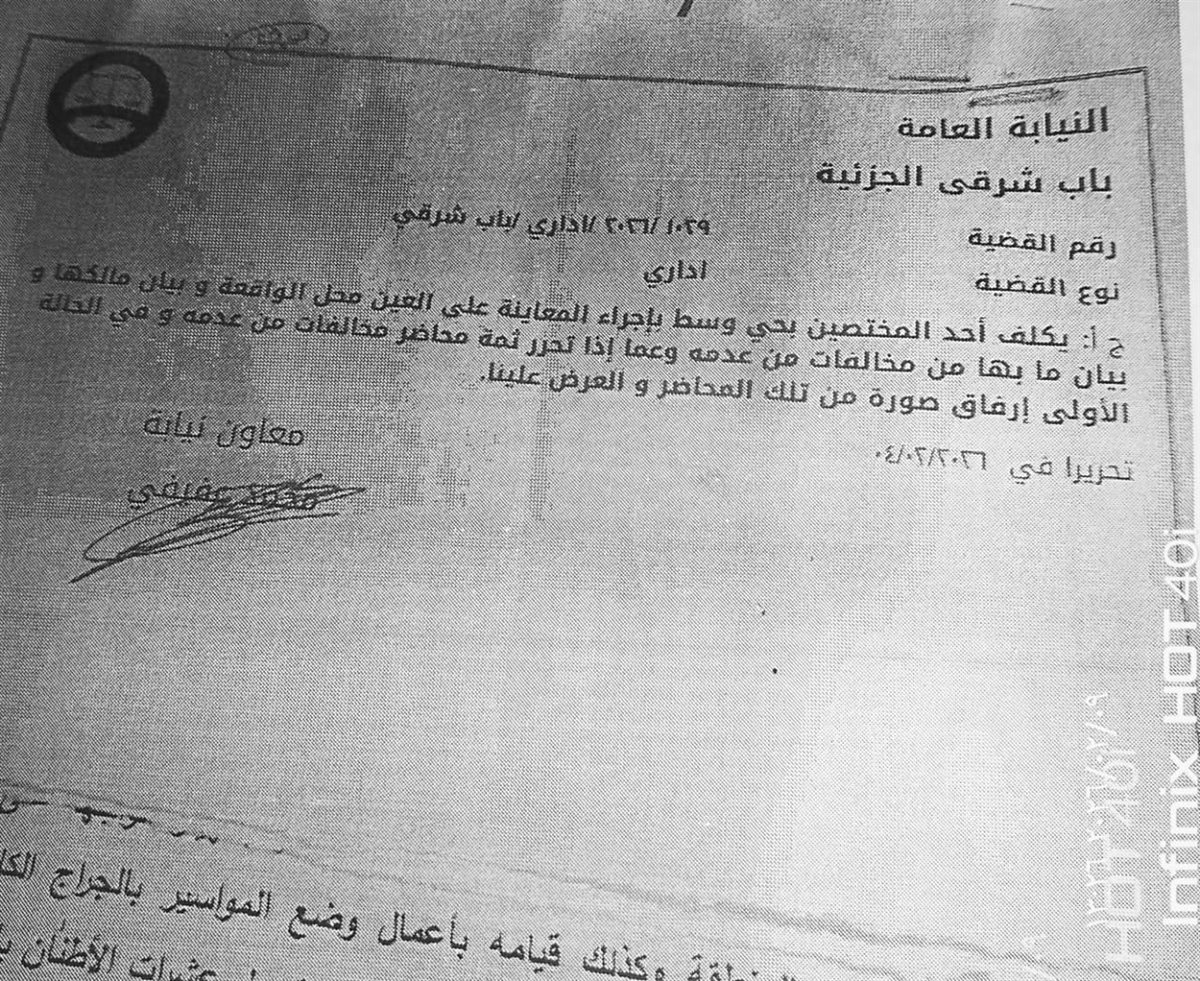 وأكد الأهالي أنهم خاطبوا حي وسط رسميًا بشأن تلك المخالفات، وحرروا المحضر المشار إليه، كما أرسلوا عدة إشارات رسمية، كان آخرها برقم 617 بتاريخ 25 فبراير 2026، مطالبين بسرعة اتخاذ الإجراءات القانونية اللازمة.