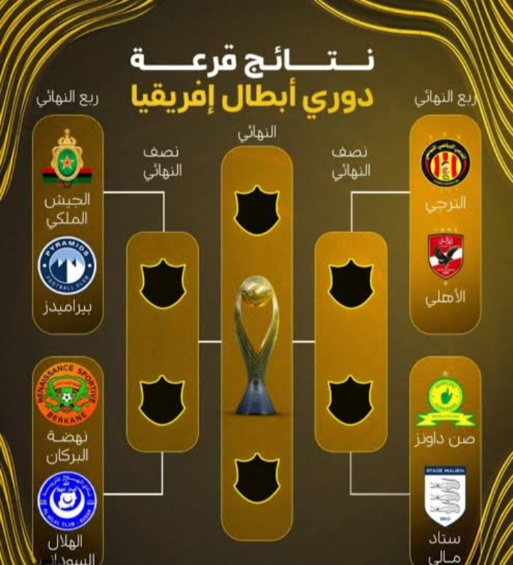 أسفرت قرعة ربع نهائي دوري أبطال أفريقيا 2025 عن مواجهة اﻷهلي مع الترجي التونسي، بيراميدز أمام الجيش الملكي المغربي في صراع التنافس على التواجد بالمربع الذهبي في المسابقة اﻷفريقية.