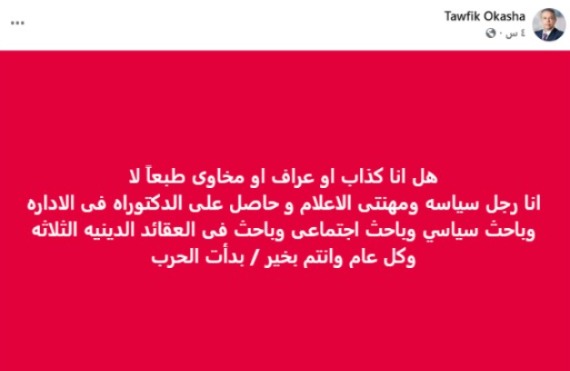 وكتب الدكتور توفيق عكاشة، عبر صفحته الرسمية على الفيسبوك، منشورًا، جاء مضمونه: طبعًا لا.. رجل سياسة ومهنتي الإعلام، وحاصل على الدكتوراه في الإدارة، وباحث سياسي واجتماعي وباحث في العقائد الدينية الثلاثة، كل عام وأنتم بخير… بدأت الحرب.