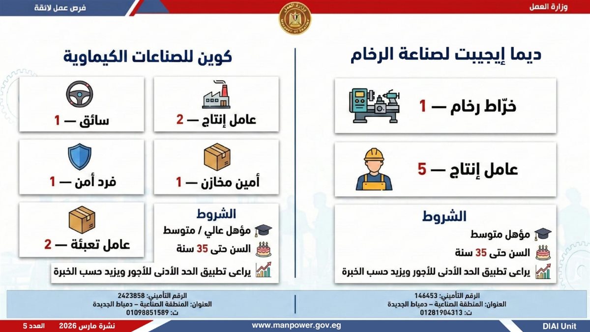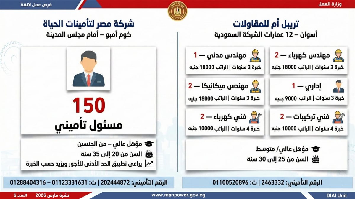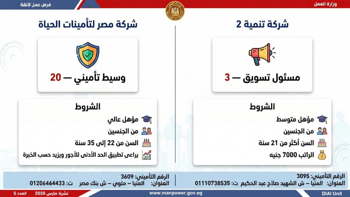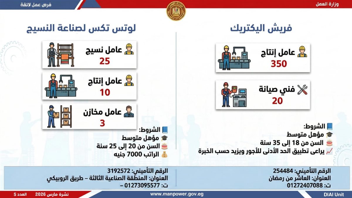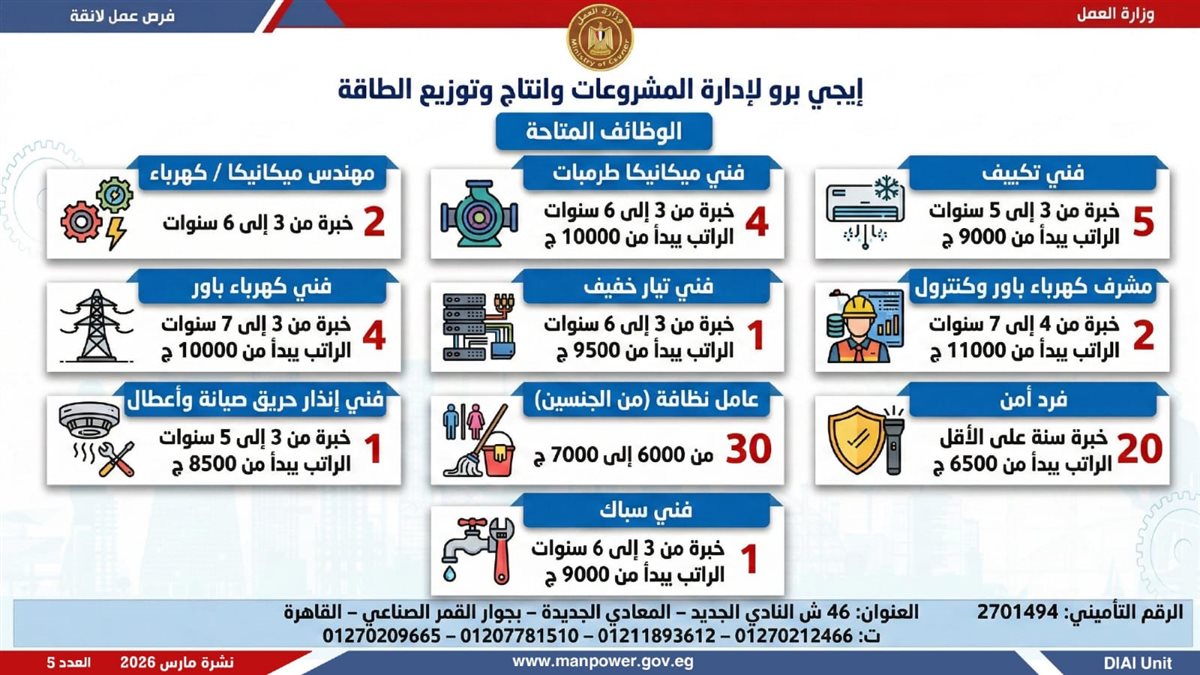 أعلنت وزارة العمل، اليوم الإثنين، إطلاق نشرة التوظيف نصف الشهرية، والتى تتضمن 5188 فرصة عمل حقيقية بالتعاون مع 60 شركة من شركات القطاع الخاص، موزعة على 11 محافظة، مع فتح باب التقديم خلال شهر مارس 2026، فى خطوة تؤكد أن العمل ليس مجرد وظيفة، بل حياة كريمة، واستقرار أسري، ومستقبل يبنى بيد المصريين.