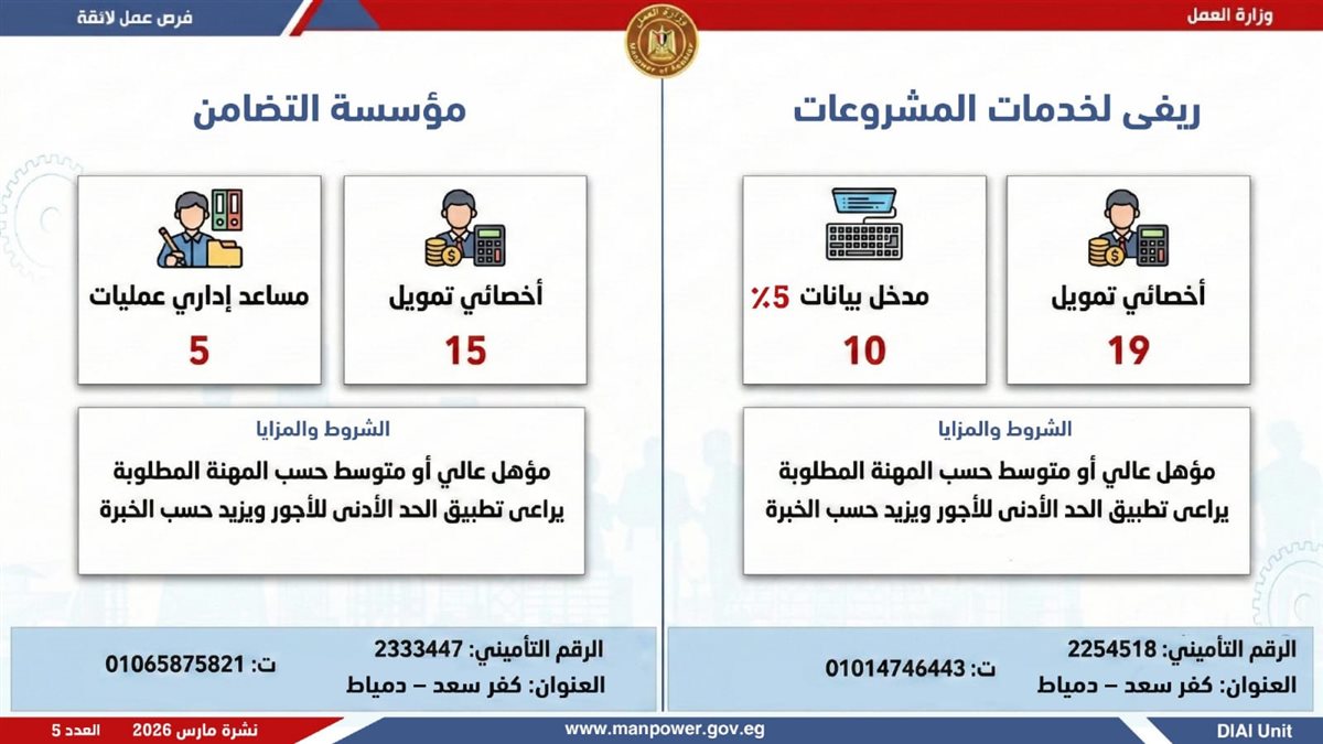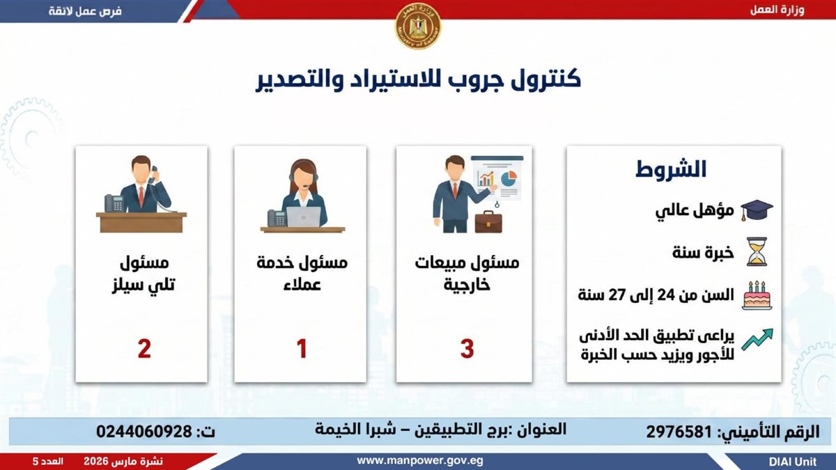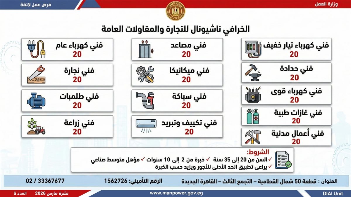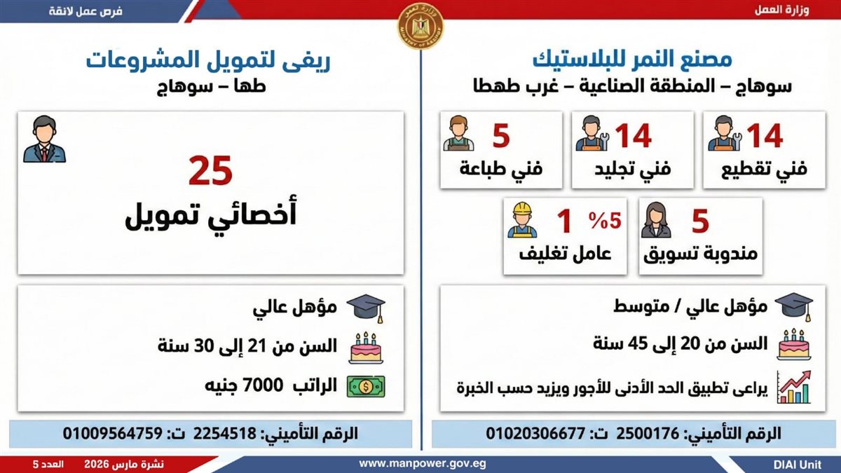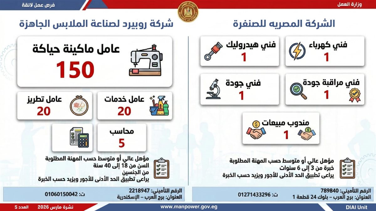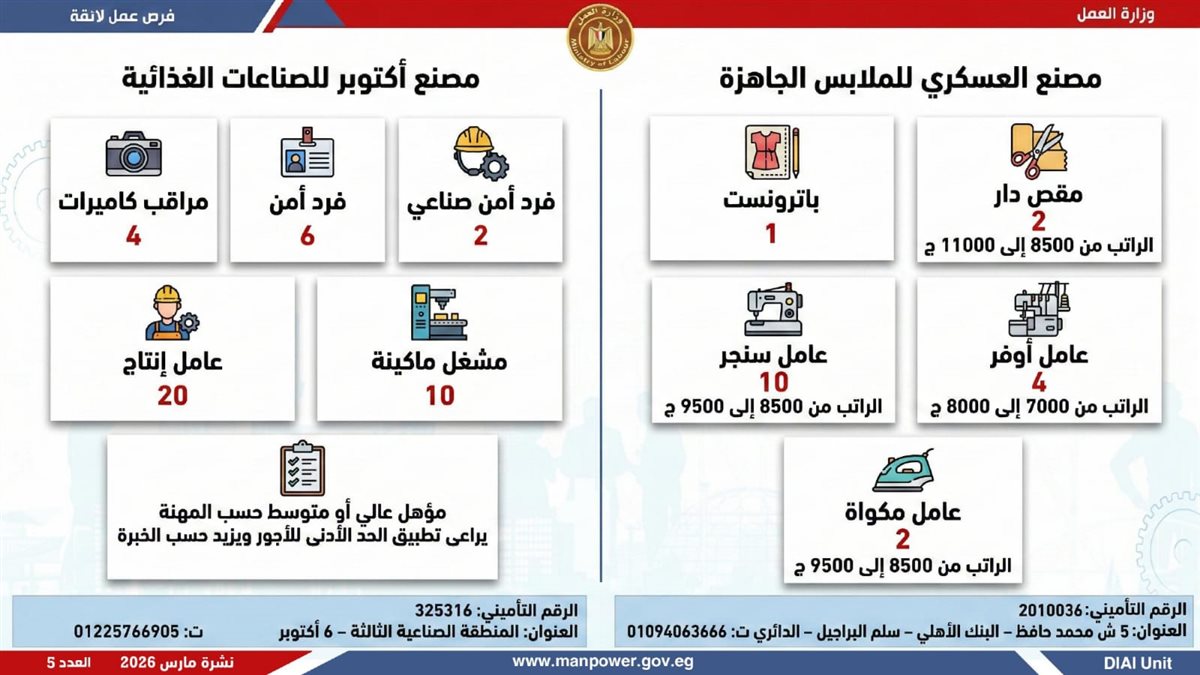 أعلنت وزارة العمل، اليوم الإثنين، إطلاق نشرة التوظيف نصف الشهرية، والتى تتضمن 5188 فرصة عمل حقيقية بالتعاون مع 60 شركة من شركات القطاع الخاص، موزعة على 11 محافظة، مع فتح باب التقديم خلال شهر مارس 2026، فى خطوة تؤكد أن العمل ليس مجرد وظيفة، بل حياة كريمة، واستقرار أسري، ومستقبل يبنى بيد المصريين.