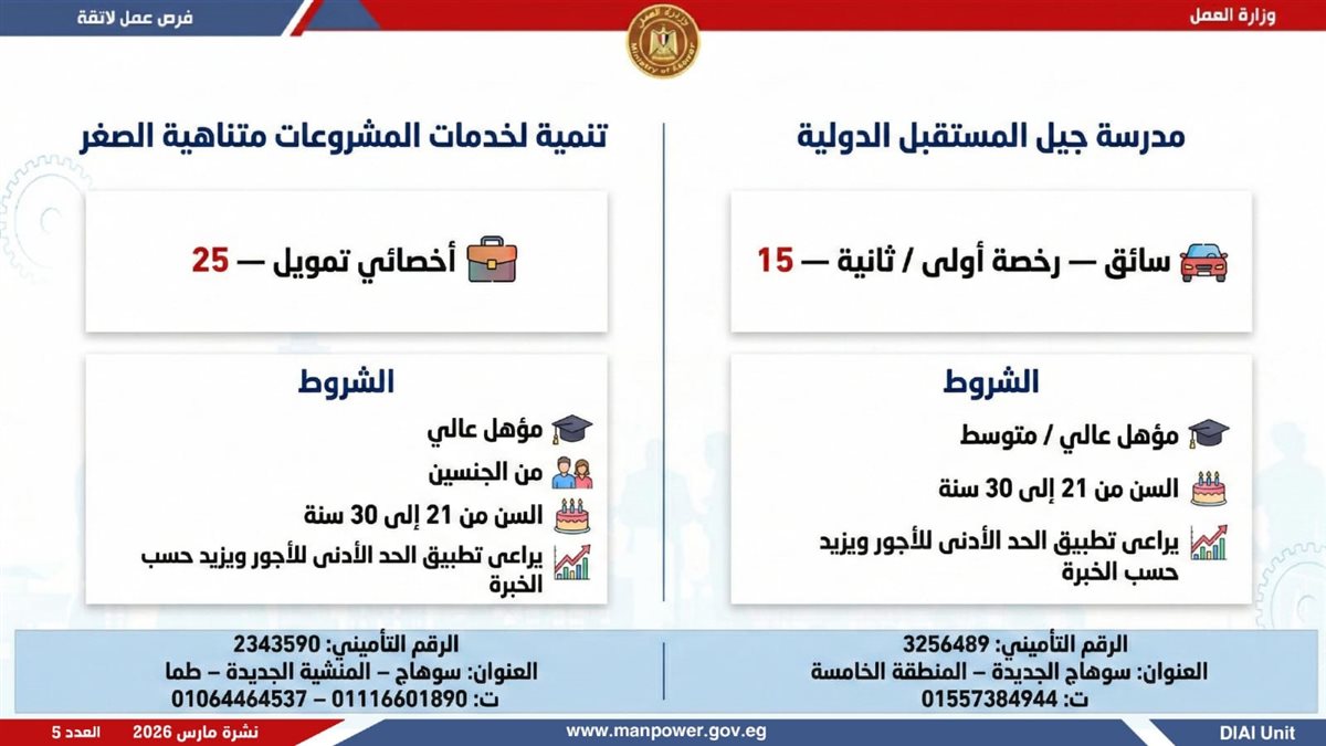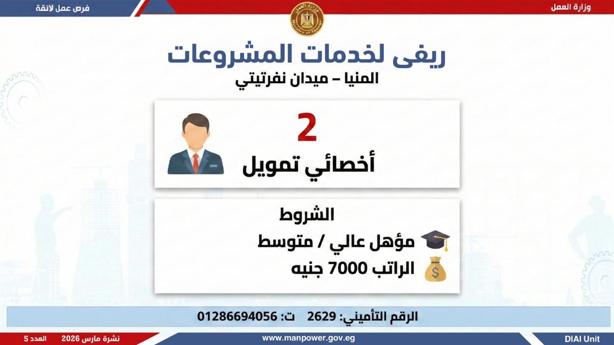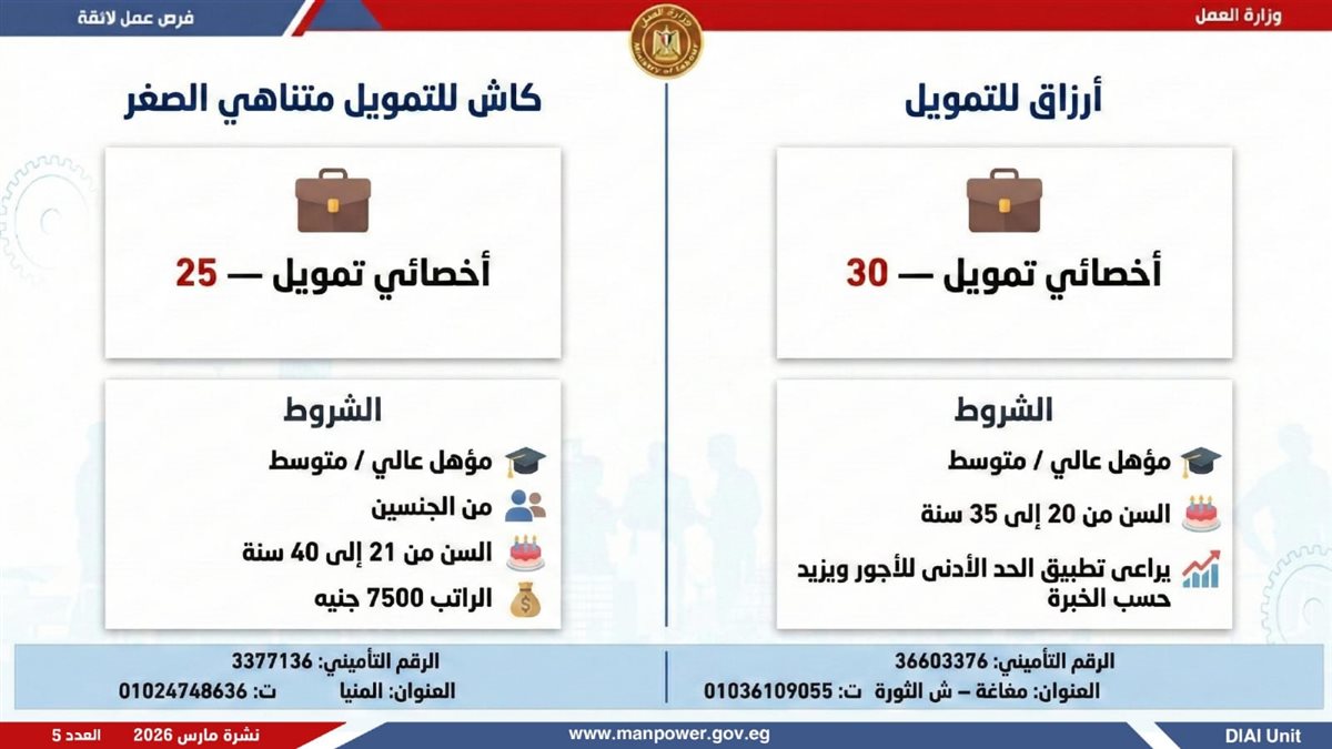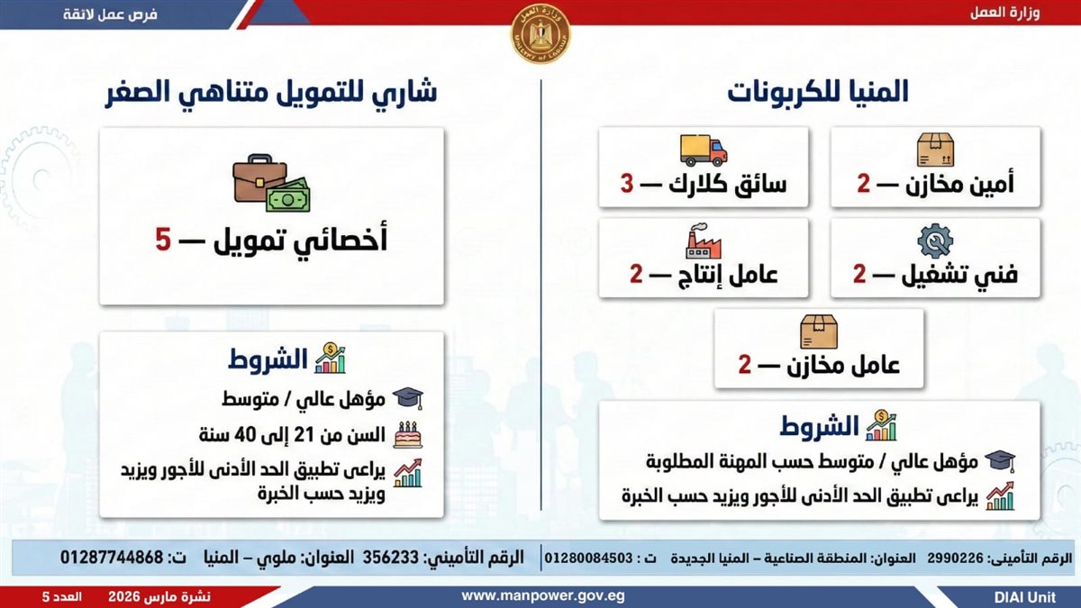 وزارة العمل تطلق 5188 فرصة عمل في 11 محافظة