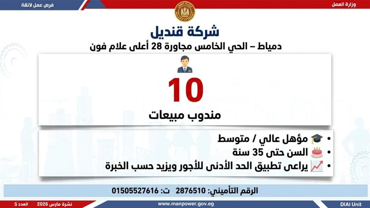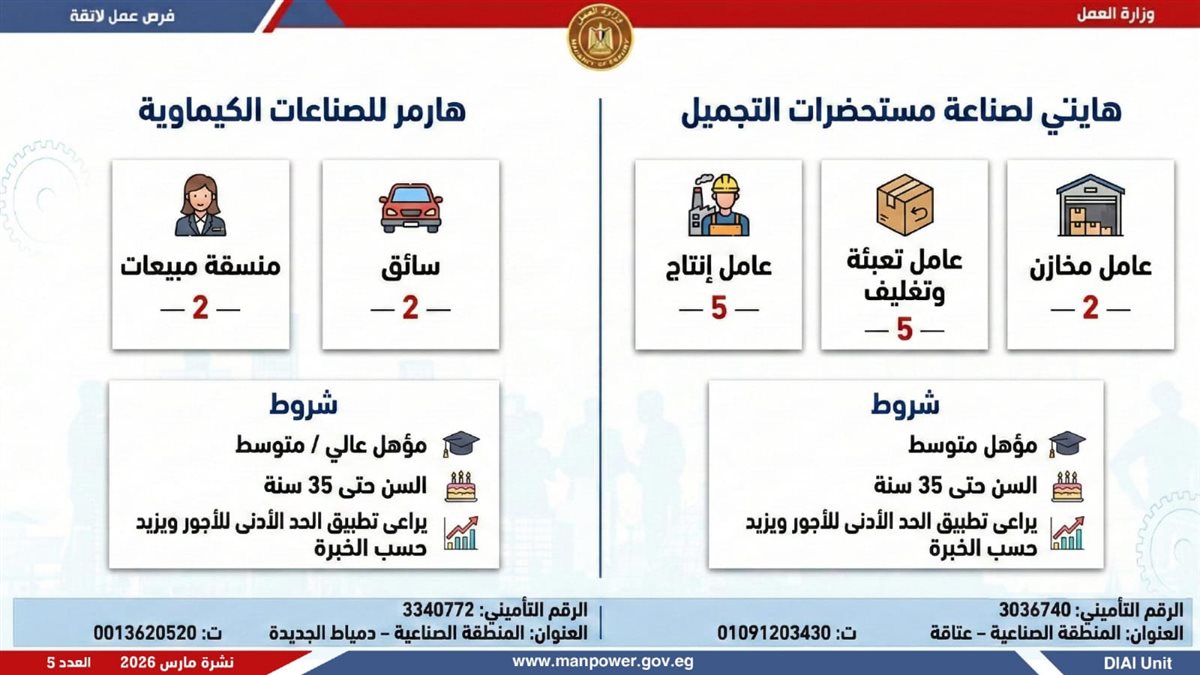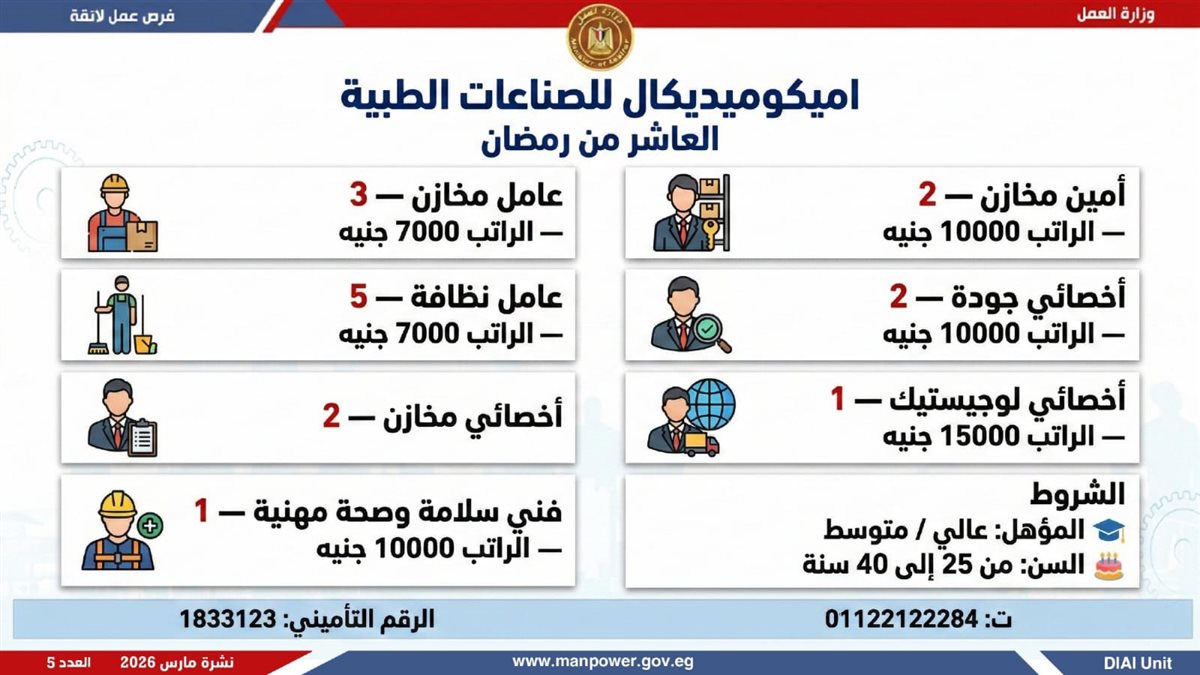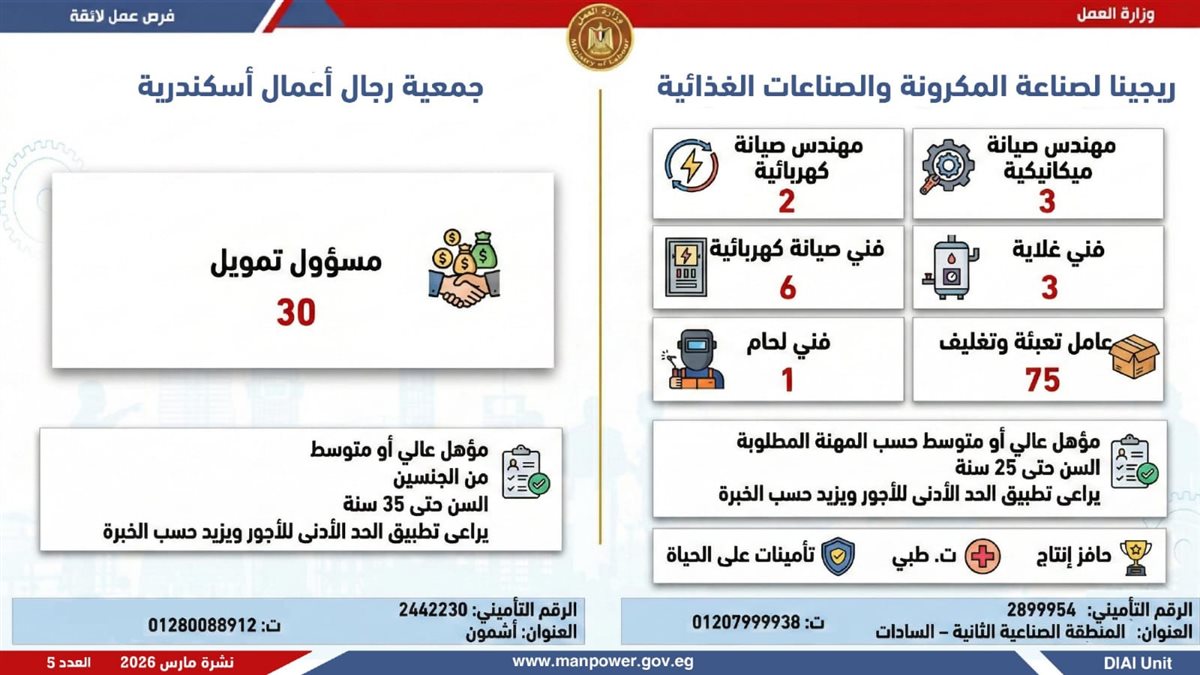 أوضحت الوزارة، أن النشرة تشمل فرص عمل متنوعة في العديد من التخصصات، برواتب مجزية بتحدد حسب الوظيفة والمقابلة الشخصية، مع تطبيق الحد الأدنى للأجور والتأمينات الاجتماعية والصحية، لضمان بيئة عمل آمنة ومستقرة، بالإضافة إلى وجود فرص مخصصة لذوي الهمم في إطار سياسة الدمج المجتمعي.