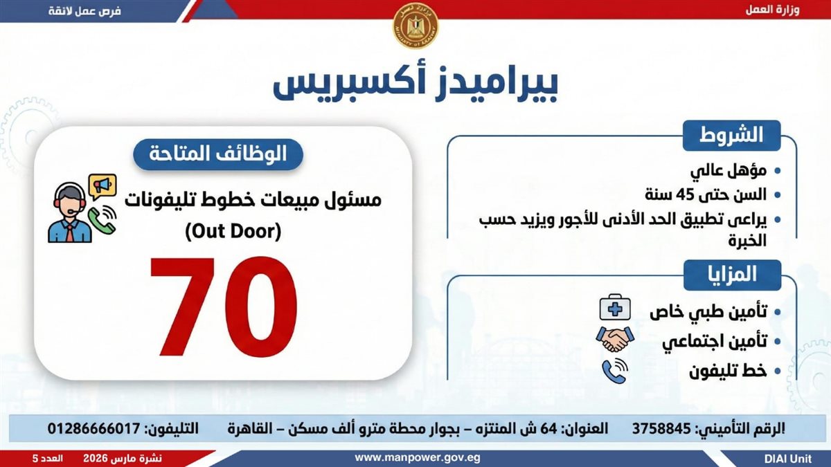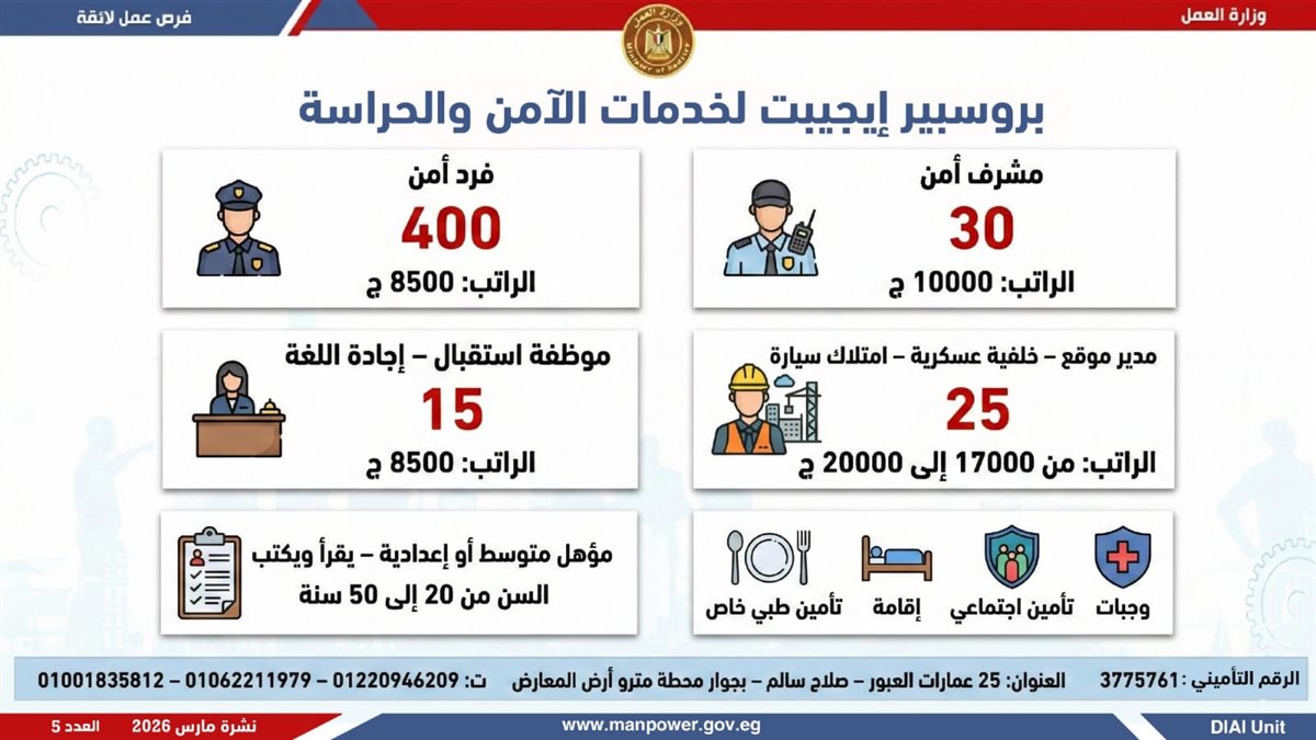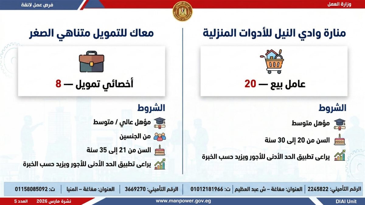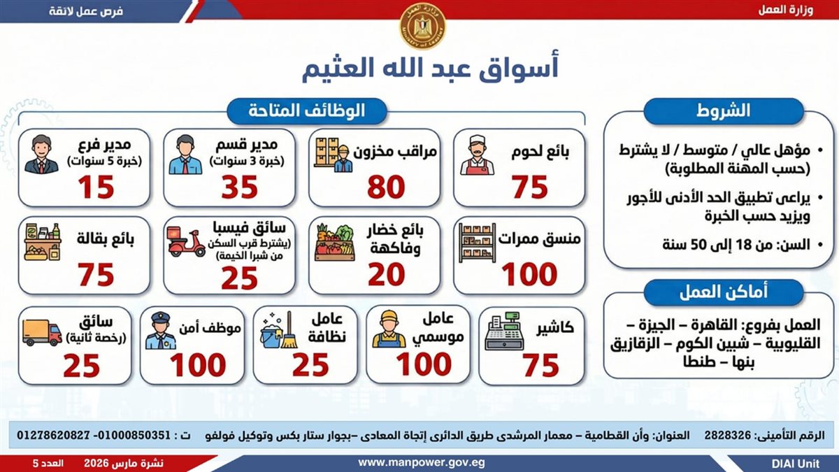 أوضحت الوزارة، أن النشرة تشمل فرص عمل متنوعة في العديد من التخصصات، برواتب مجزية بتحدد حسب الوظيفة والمقابلة الشخصية، مع تطبيق الحد الأدنى للأجور والتأمينات الاجتماعية والصحية، لضمان بيئة عمل آمنة ومستقرة، بالإضافة إلى وجود فرص مخصصة لذوي الهمم في إطار سياسة الدمج المجتمعي.