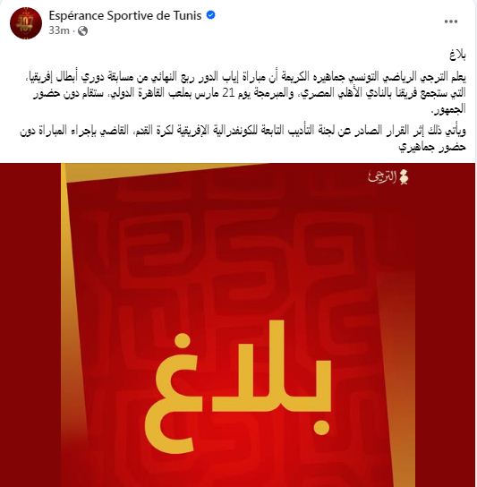 وقال نادي الترجي الرياضي التونسي في بيان صادر عبر صفحته الرسمية بموقع "فيس بوك": يأتي ذلك إثر القرار الصادر عن لجنة التأديب التابعة للكونفدرالية الأفريقية لكرة القدم، القاضي بإجراء المباراة دون حضور جماهيري"، على خلفية أحداث الشغب التي شهدتها مباراة الأهلي والجيش الملكي المغربي، ضمن منافسات الجولة السادسة والأخيرة لدور المجموعات في بطولة دوري أبطال أفريقيا.