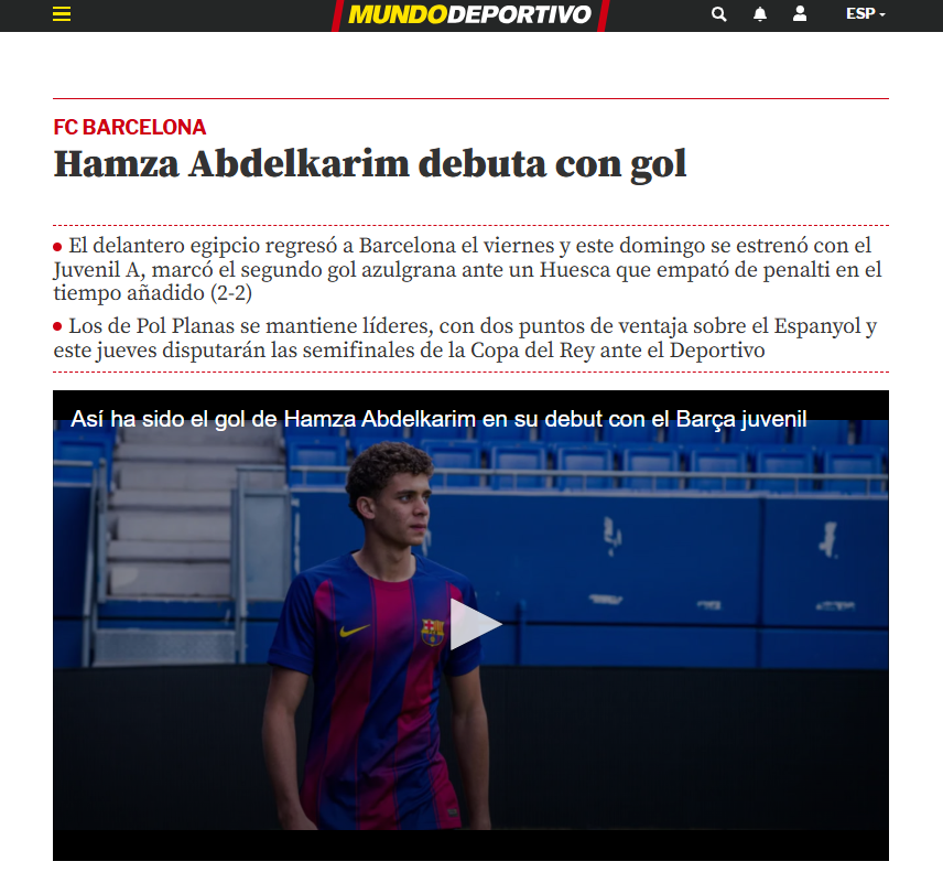 تغنت الصحافة الإسبانية بالاعب المصري حمزة عبر الكريم، مهاجم نادي برشلونة، بعد تسجيله هدف في مباراة فريقه أمام هويسكا والتسبب في ركلة جزاء في أول ظهور له مع الفريق الكتالوني.