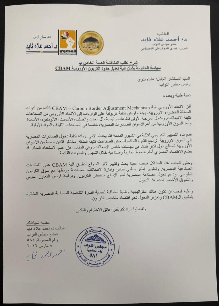 تقدم النائب أحمد علاء فايد، عضو مجلس النواب المصري عن الحزب المصري الديمقراطي الاجتماعي، بطلب مناقشة عامة إلى المستشار هشام بدوي رئيس المجلس، لمناقشة سياسة الحكومة تجاه آلية تعديل حدود الكربون الأوروبية (CBAM) وتأثيرها المحتمل على الصادرات والصناعة المصرية.