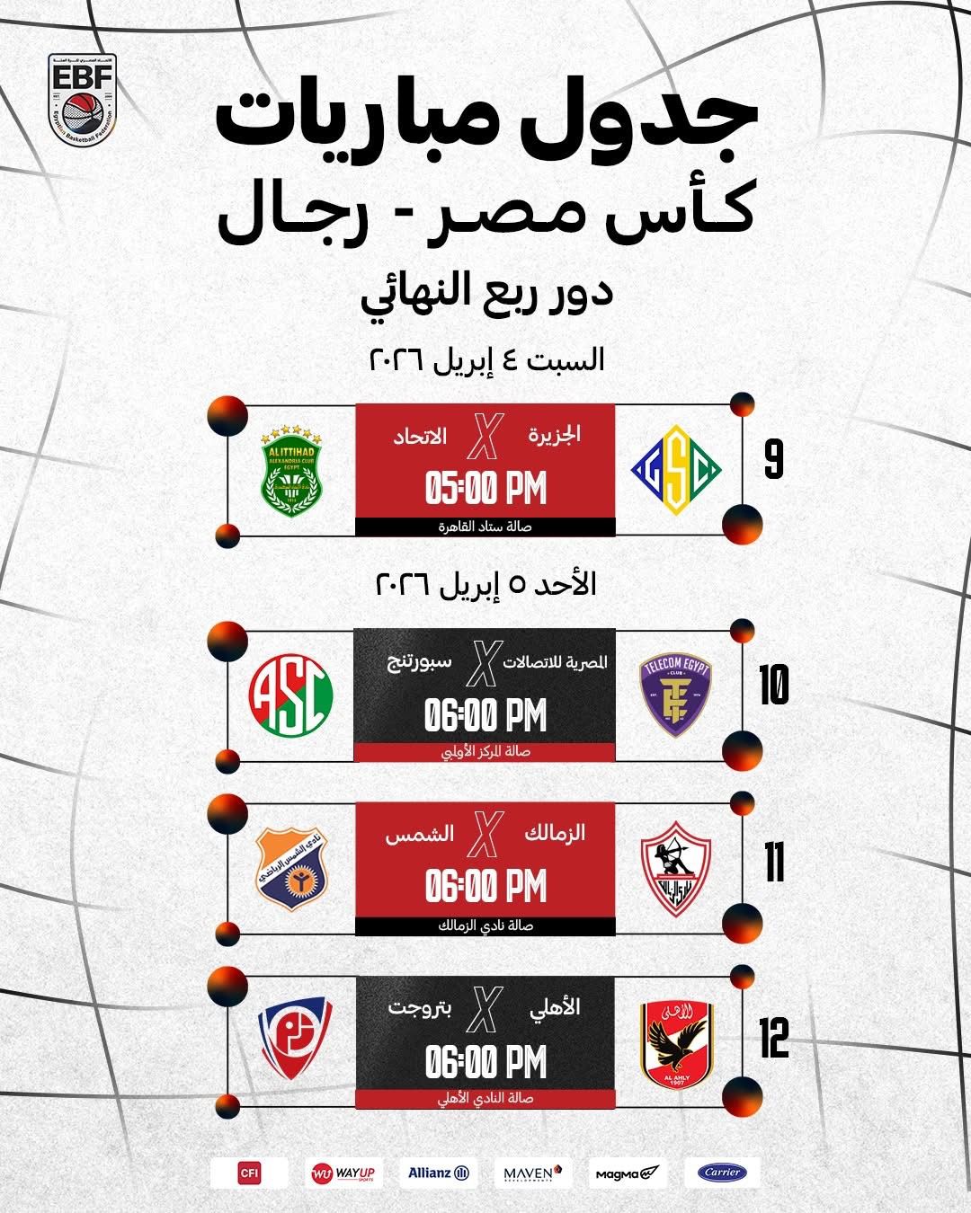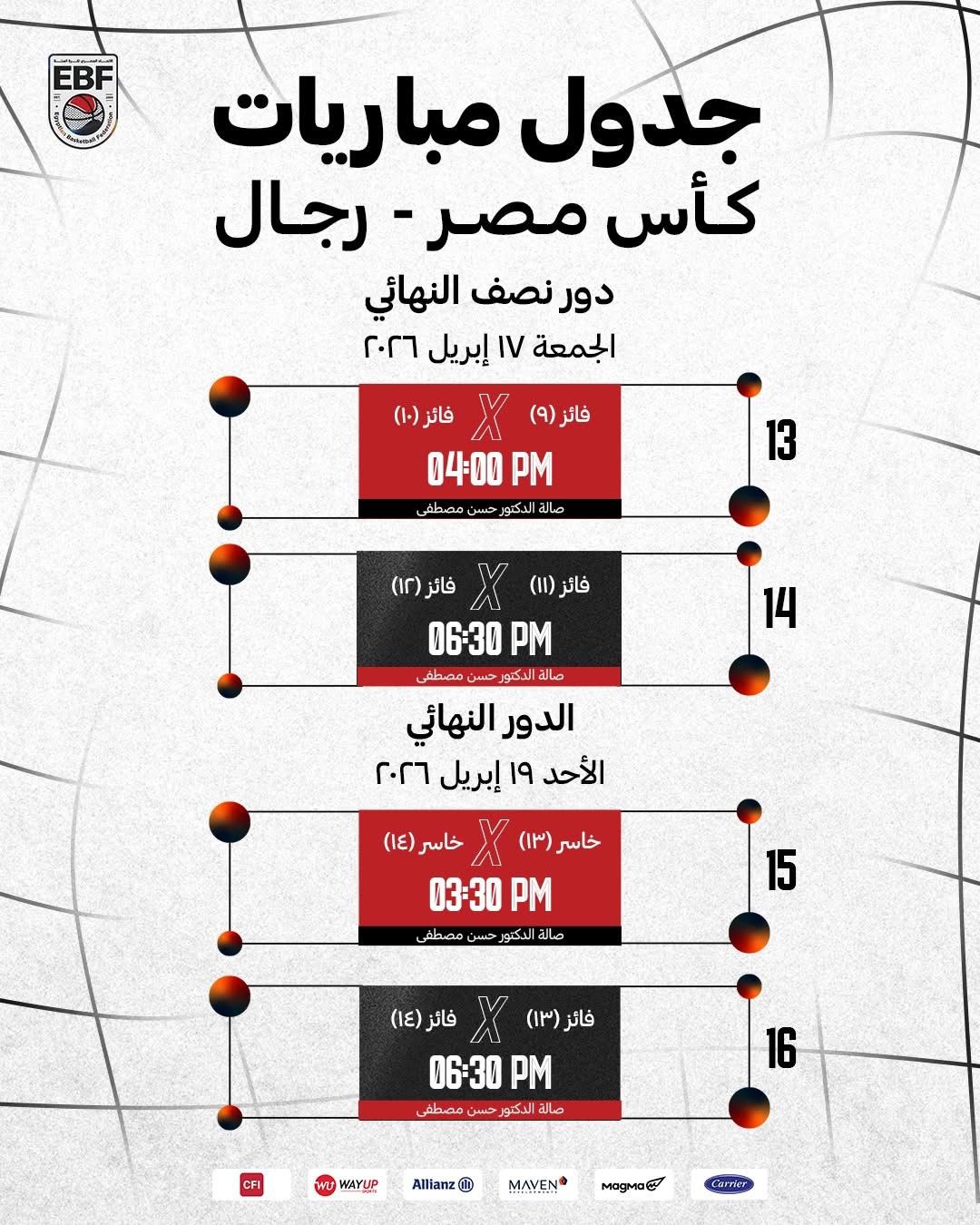أعلن الاتحاد المصري لكرة السلة برئاسة عمرو مصيلحي، مواعيد الأدوار النهائية ببطولة كأس مصر للرجال للموسم الحالي 2025-2026.