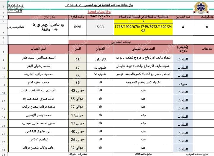 ننشر أسماء المصابين والمتوفين في حادث السادات بمحافظة المنوفية