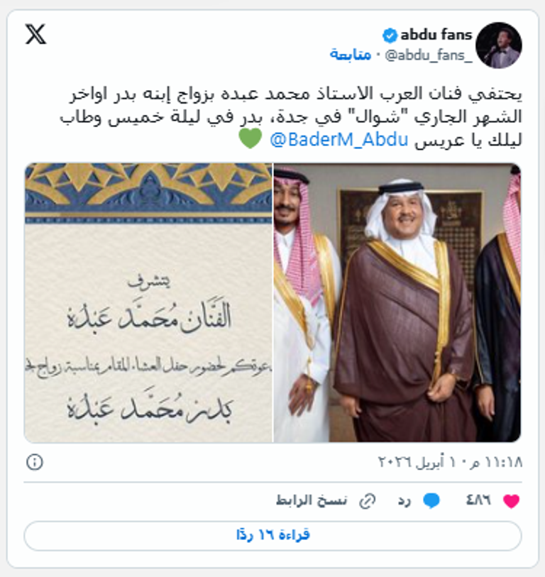 وكان محمد عبده قد احتفل في وقت سابق بعقد قران نجله بدر خلال شهر ديسمبر الماضي، في حفل مميز ظهر خلاله مرتدي الزي التقليدي "البشت"، وشارك الحضور لحظات احتفالية لافتة، تضمنت أداء رقصة شعبية، إلى جانب وصلة غنائية قدم فيها واحدة من الأغنيات التراثية التي لاقت تفاعل كبيرمن الحضور.
