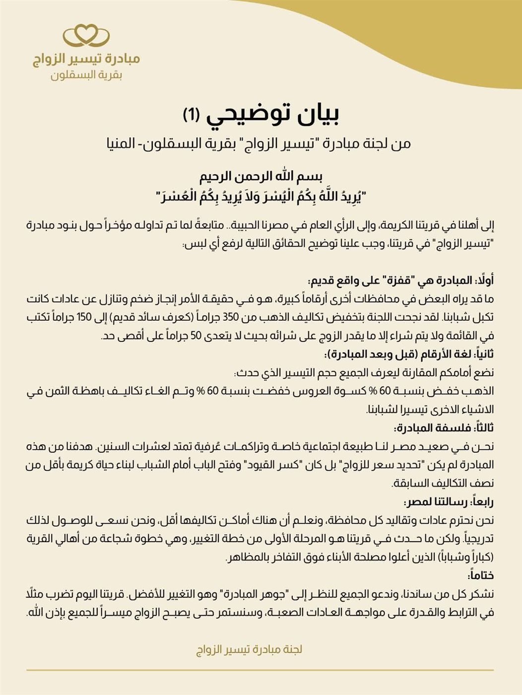 وفي المقابل، أصدرت لجنة مبادرة "تيسير الزواج" بيانًا توضيحيًا – كما في الصورة المتداولة – أكدت خلاله أن الهدف الأساسي ليس تحديد أسعار أو "تسعير الزواج"، بل كسر العادات الاجتماعية المغالية وفتح الباب أمام الشباب لبناء حياة مستقرة بتكاليف أقل، مشددة على أن المبادرة تمثل خطوة أولى للتغيير التدريجي داخل المجتمع.