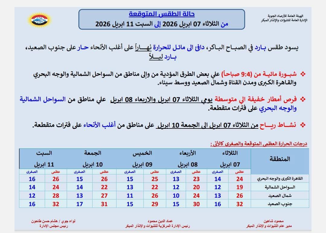 كشفت هيئة الأرصاد الجوية، عن حالة الطقس المتوقعة، من الثلاثاء 7 أبريل 2026 إلى السبت 11 أبريل من نفس ذات الشهر، موضحة: يسود طقس بارد في الصباح الباكر، ودافئ إلى مائل للحراراة نهارًا على أغلب الأنحاء، وحار على جنوب الصعيد، وبارد ليلًا.