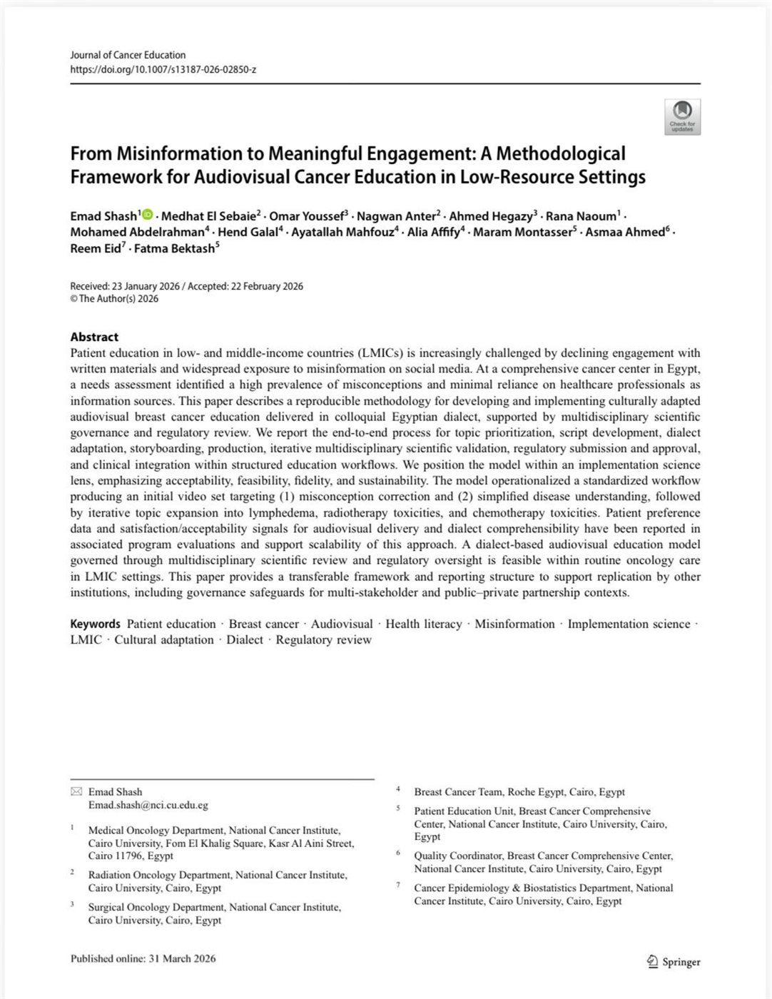 أعلن الدكتور محمد سامي عبد الصادق، رئيس جامعة القاهرة، عن تحقيق المعهد القومي للأورام إنجازًا علميا جديدًا يضاف إلى رصيد الجامعة، حيث نجح فريق من الباحثين بالمعهد القومي للأورام في نشر دراسة علمية جديدة في مجلة “Cancer Education” التابعة لـ “Springer Nature” تحت عنوان: من المعلومات المضللة إلى المشاركة الفعّالة: إطار منهجي للتثقيف السمعي البصري حول السرطان في الدول ذات الموارد المحدودة.
