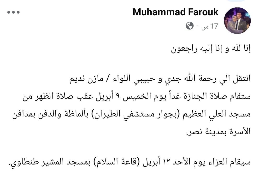 وكان نجل الدكتور شريف فاروق قد أعلن خبر الوفاة عبر حسابه الرسمي على مواقع التواصل الاجتماعي، قائلاً: «إنا لله وإنا إليه راجعون.. انتقل إلى رحمة الله جدي وحبيبي اللواء مازن نديم».