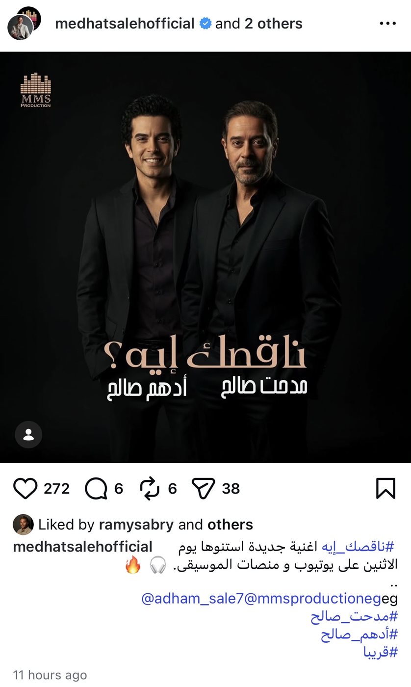 ونشر مدحت صالح عبر حسابه الرسمي على موقع إنستجرام رسالة قال فيها: "ناقصك إيه.. أغنية جديدة استنوها يوم الاثنين على يوتيوب ومنصات الموسيقى".