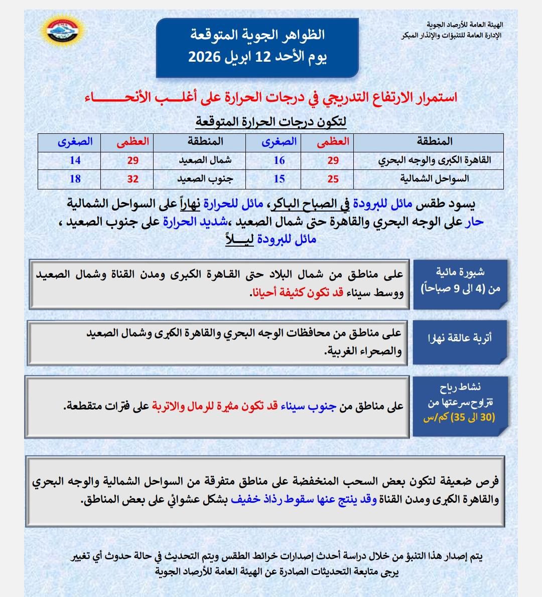 كشفت هيئة الأرصاد الجوية، عن حالة الطقس ودرجات الحرارة، غدًا الأحد 12 أبريل 2026، قائلة: استمرار الارتفاع التدريجي في درجات الحرارة على أغلب الأنحاء لتكون درجة الحرارة المتوقعة على القاهرة الكبرى والوجه البحري العظمي 29، والصغري 16 درجة مئوية.