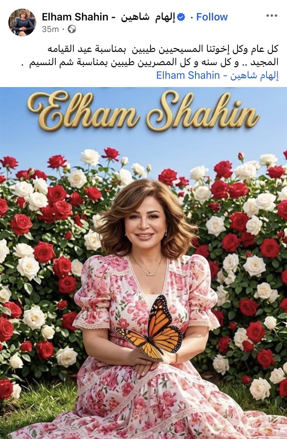 وكتبت إلهام شاهين عبر حسابها الشخصي على موقع التواصل الاجتماعي "فيسبوك": "كل عام وكل إخوتنا المسيحيين طيبين بمناسبة عيد القيامة المجيد وكل سنة وكل المصريين طيبين بمناسبة شم النسيم".