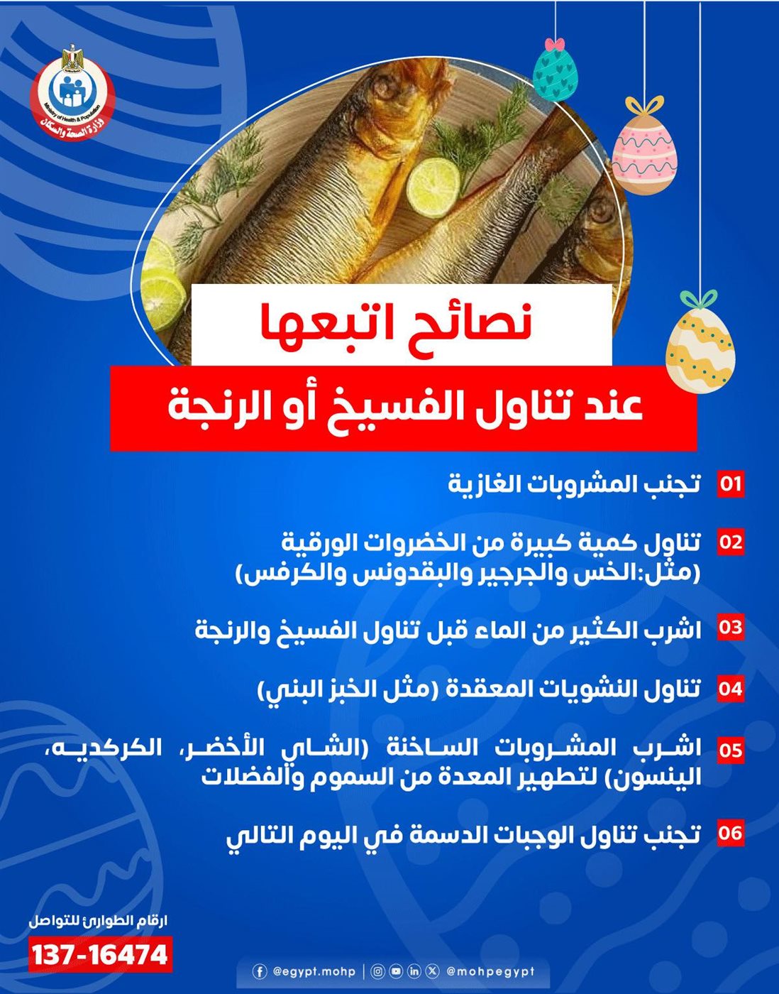 وجهت وزارة الصحة والسكان عبر صفحتها الرسمية على الفيسبوك، عدة نصائح للمواطنين عند تناول الفسيخ أو الرنجة خلال شم النسيم، مشيرة إلى أنه لابد من اتباعها حتى ألا تتعرض للتسمم.