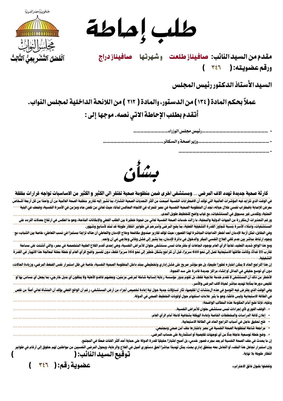 تقدمت النائبة صافيناز طلعت بطلب إحاطة إلى رئيس مجلس الوزراء ووزير الصحة والسكان، بشأن ما وصفته بالتدهور المقلق في منظومة الصحة النفسية في مصر، وعلى رأسها الغموض الذي يحيط بمصير مستشفى حلوان للأمراض النفسية.