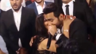 "قبلة وحضن.. هجوم معجبة كبيرة في السن على تامر حسني (فيديو)