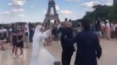 "زفة بلدي بباريس".. عروسان مصريان يحتفلان بزواجهما أمام برج "إيفل"