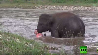 "اعتقد أنه يغرق".. فيل يهرع لإنقاذ رجل يسبح في نهر (فيديو)