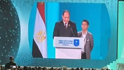 "الرئيس الأب" يصطحب الطفل زين أثناء إلقاء كلمته في ختام منتدى شباب العالم