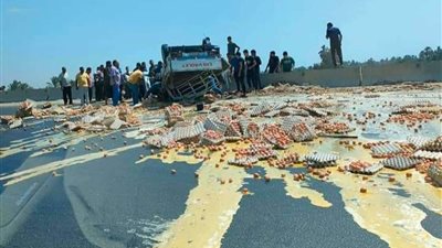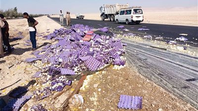 "من تاني".. البيض يملئ الطريق الصحراوي الغربي بعد انقلاب سيارة نقل بقنا
